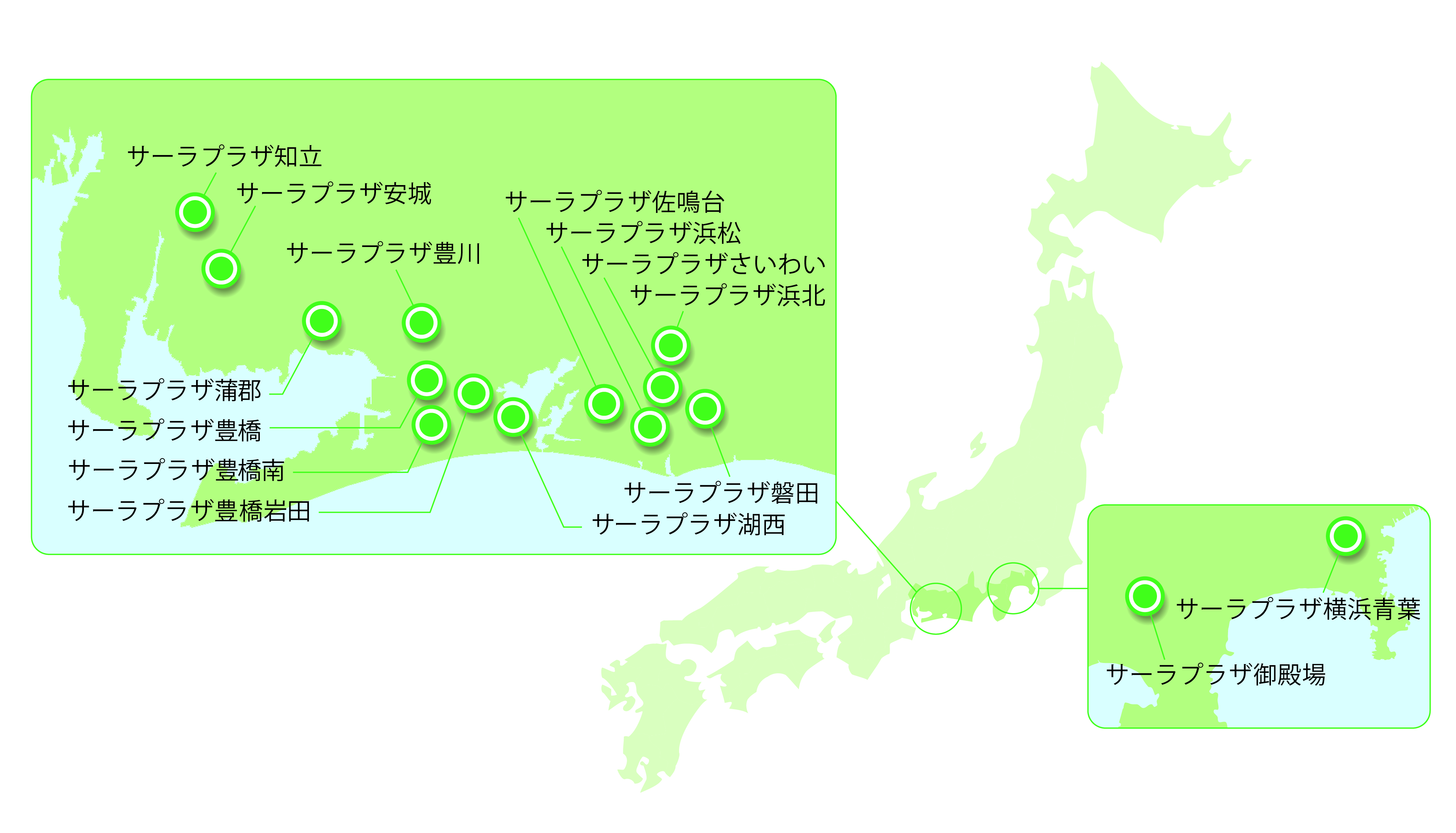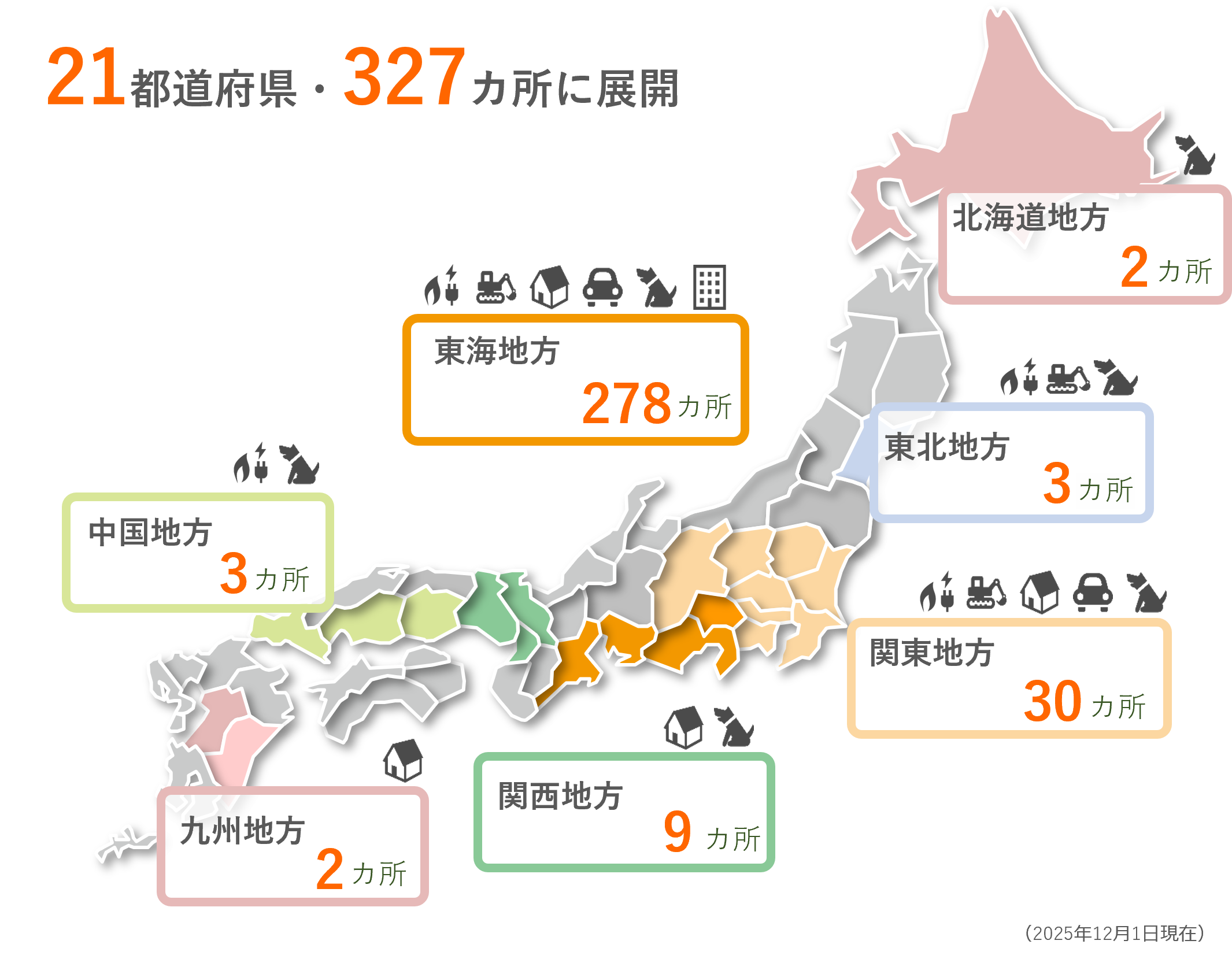 愛知県東部、静岡県西部を中心に22都道府県に拠点を置き、地域密着で事業を展開しています。