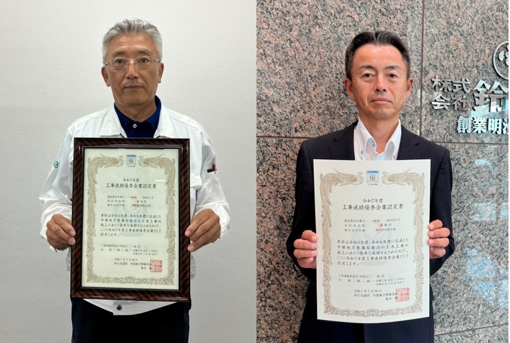 <国土交通省 中部地方整備局> 工事成績優秀企業認定(7月30日) 過去2年(令和5年度・6年度)に完成した土木工事の工事成績評定の結果をもとに評定点の平均点が80点以上の企業を工事成績優秀企業として認定する制度です