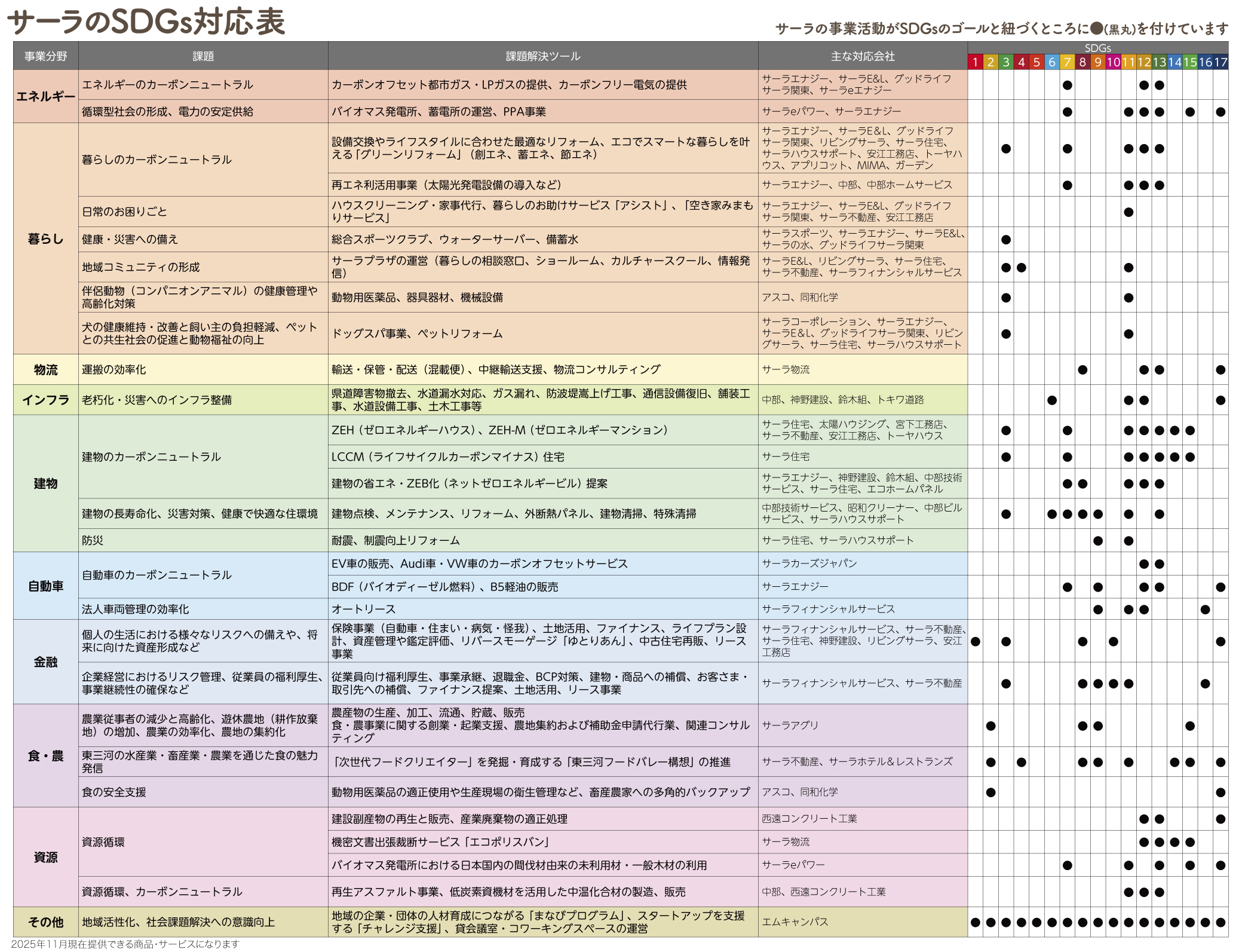 サーラグループは、サステナビリティ方針のもと特定した重要課題(マテリアリティ)について対応方針及びリスクと機会を 設定し、指標・目標を定めています。2030年ビジョン「私のまちにSALA、暮らしとともにSALA」の実現に向けて、様々な事業活 動を通じて地域社会の課題解決に取り組み、SDGsの達成に貢献しています。