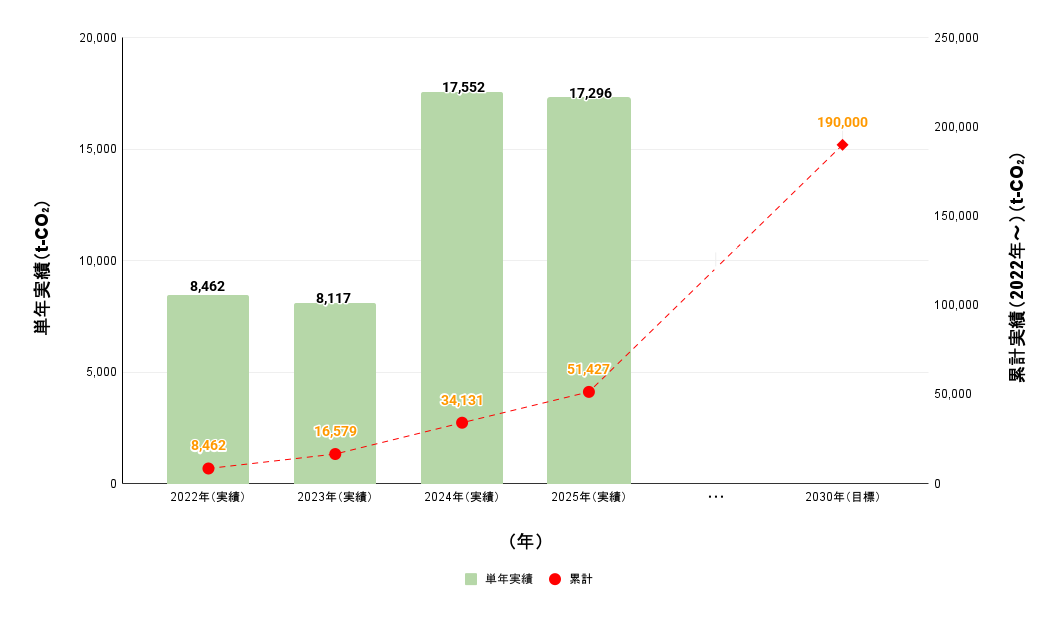 また、エネルギー機器の高効率化や省エネ・創エネサービスの提供によるお客さま先の商品・サービスの使用を通じたCO2排出削減貢献量は、2022年度〜2025年度累計実績は51,427トンであり、目標である55,000トンは達成出来ませんでしたが、環境意識の高まりを背景に高効率機器への切り替え需要は底堅く推移しており、導入実績は着実に増加しております。今後も、地域に根差した提案活動を通じてお客さまの環境負荷低減に寄与し、持続可能な社会の実現をめざします。
